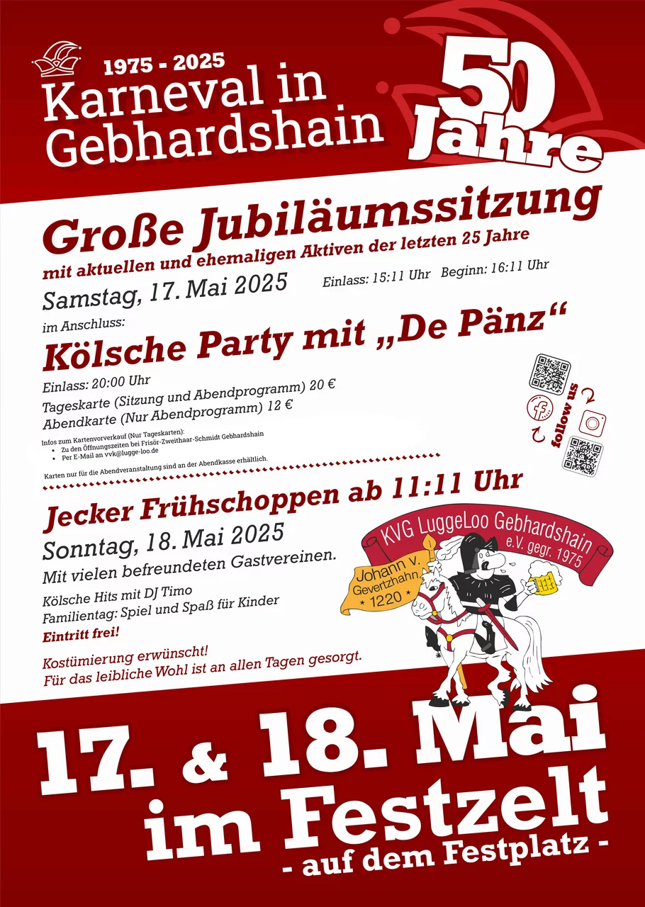 Im Vorverkauf sind ausschließlich Tageskarten erhätlich. Diese sind gültig für die große Jubiläumssitzung und die anschließende Abendveranstaltung. Die Tageskarten können an folgenden Stellen erworben werden: